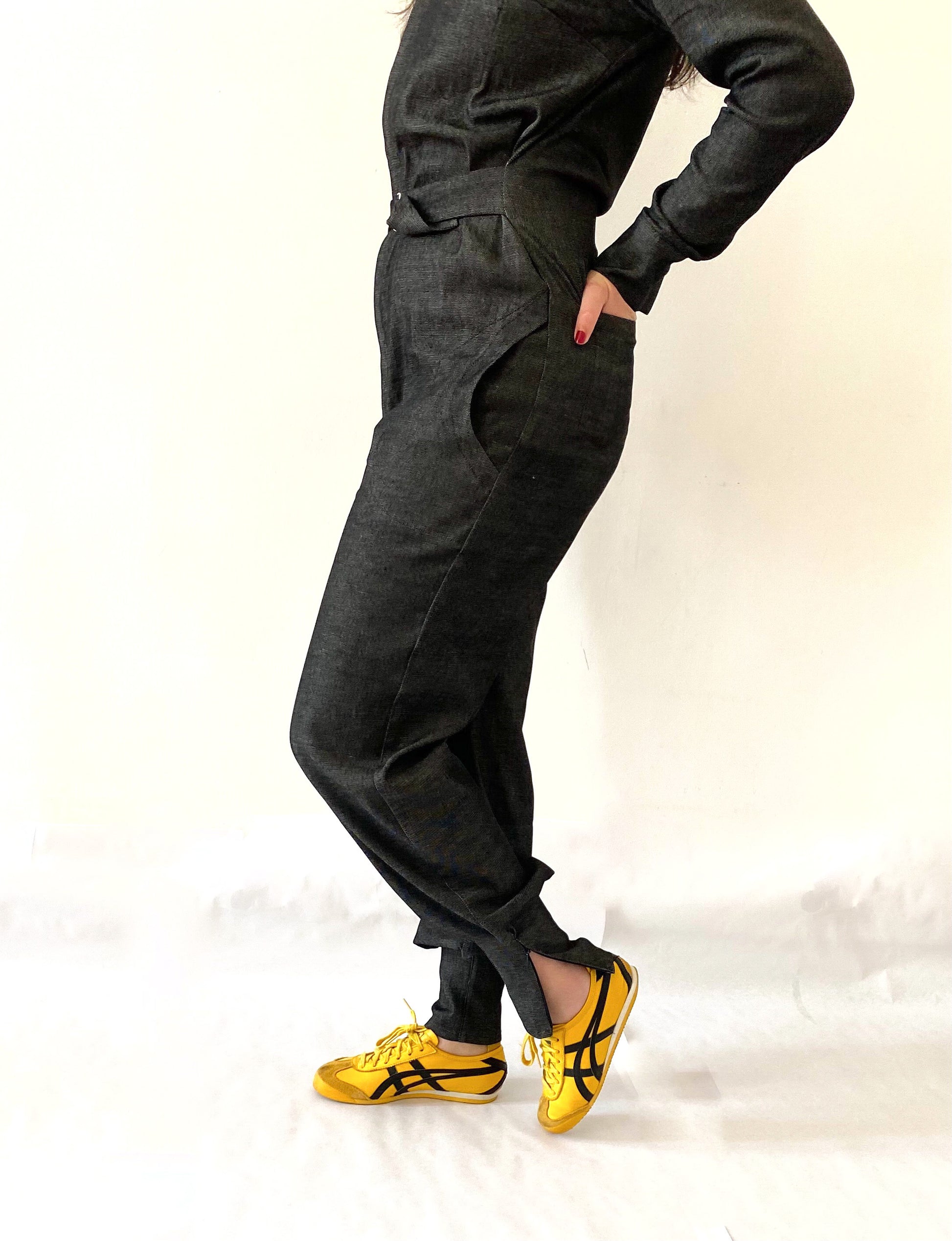 son originalité se retrouve au bas du pantalon par un resserrement à la cheville avec un jeu de découpe et un zip