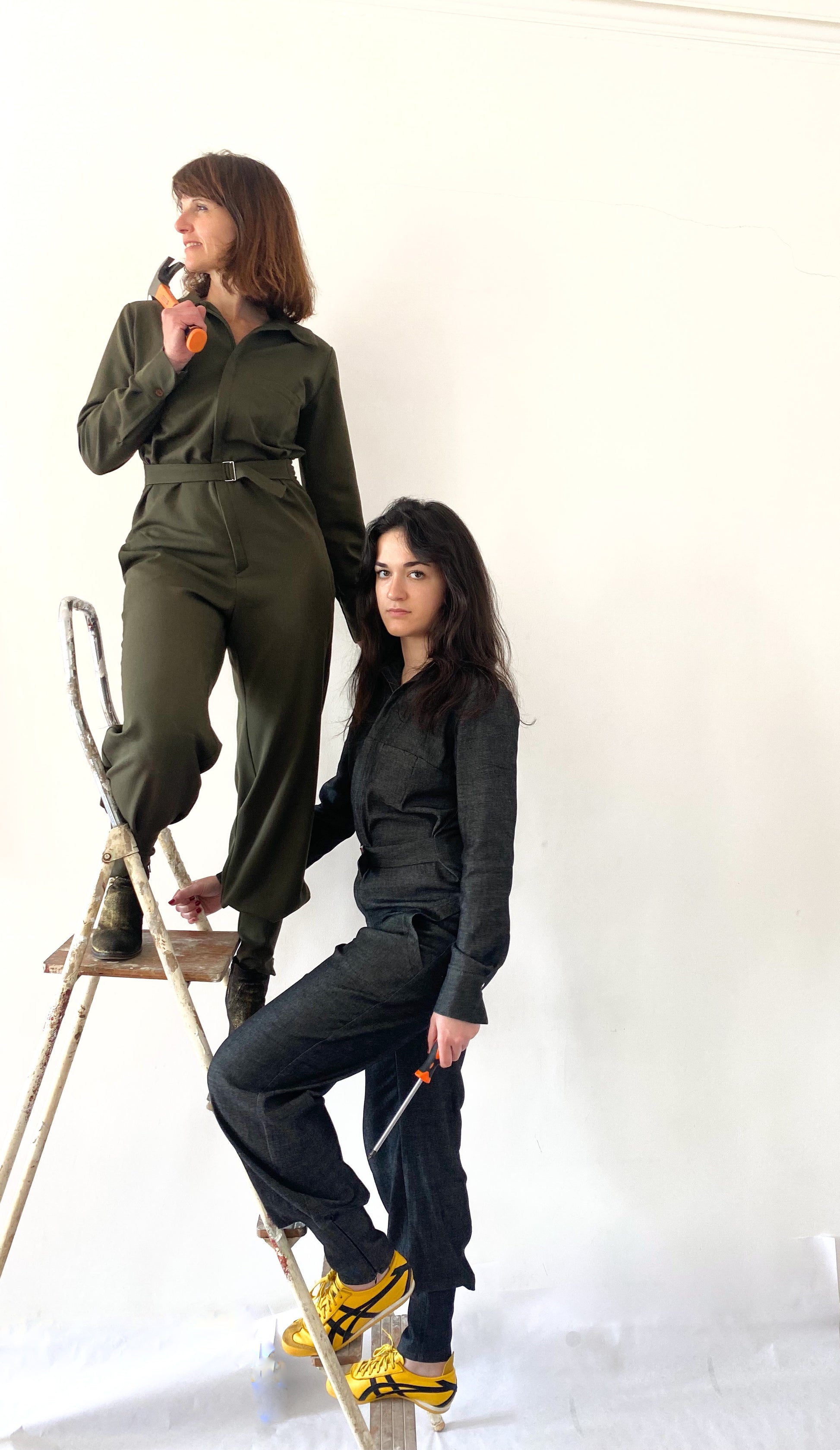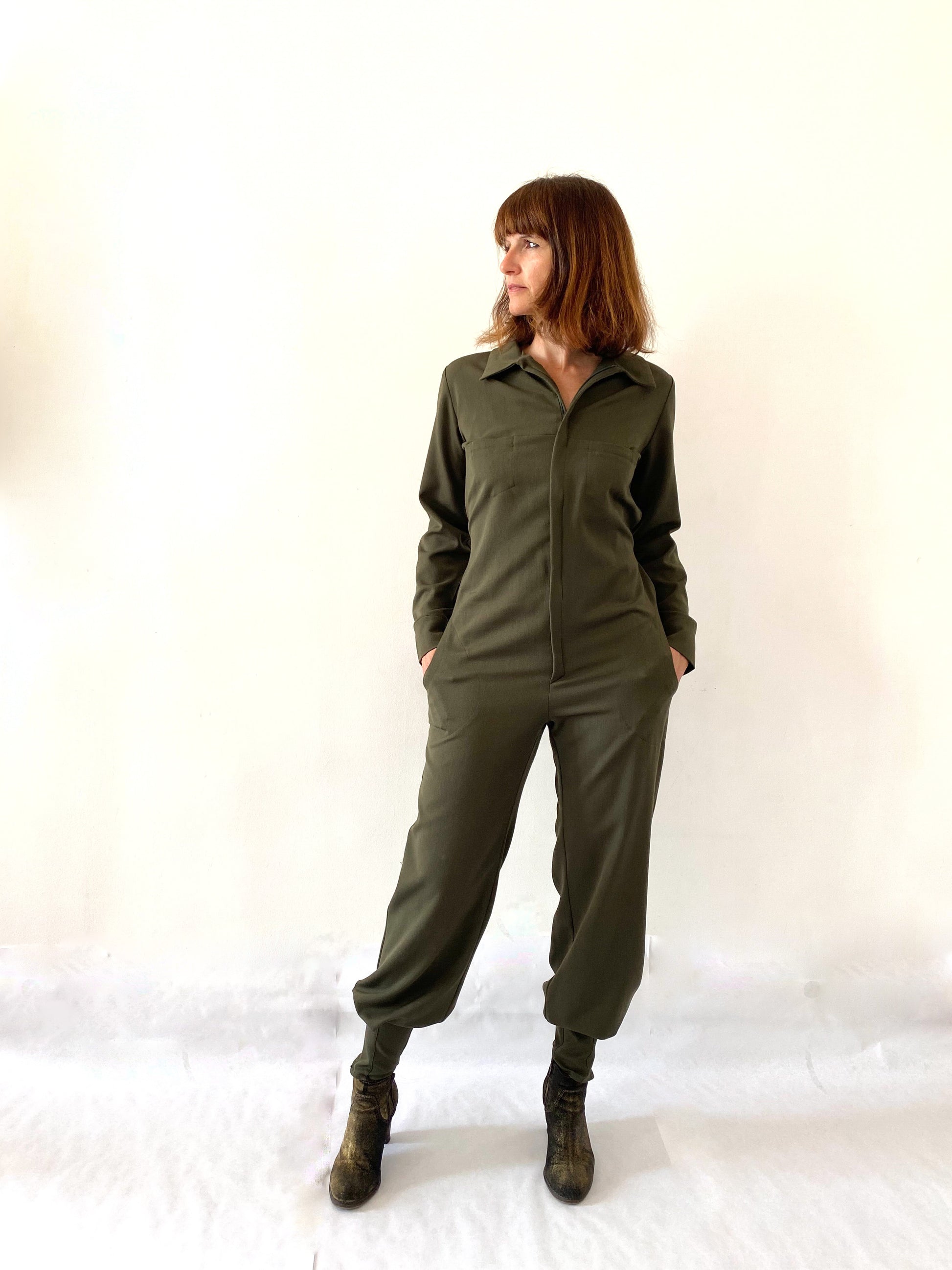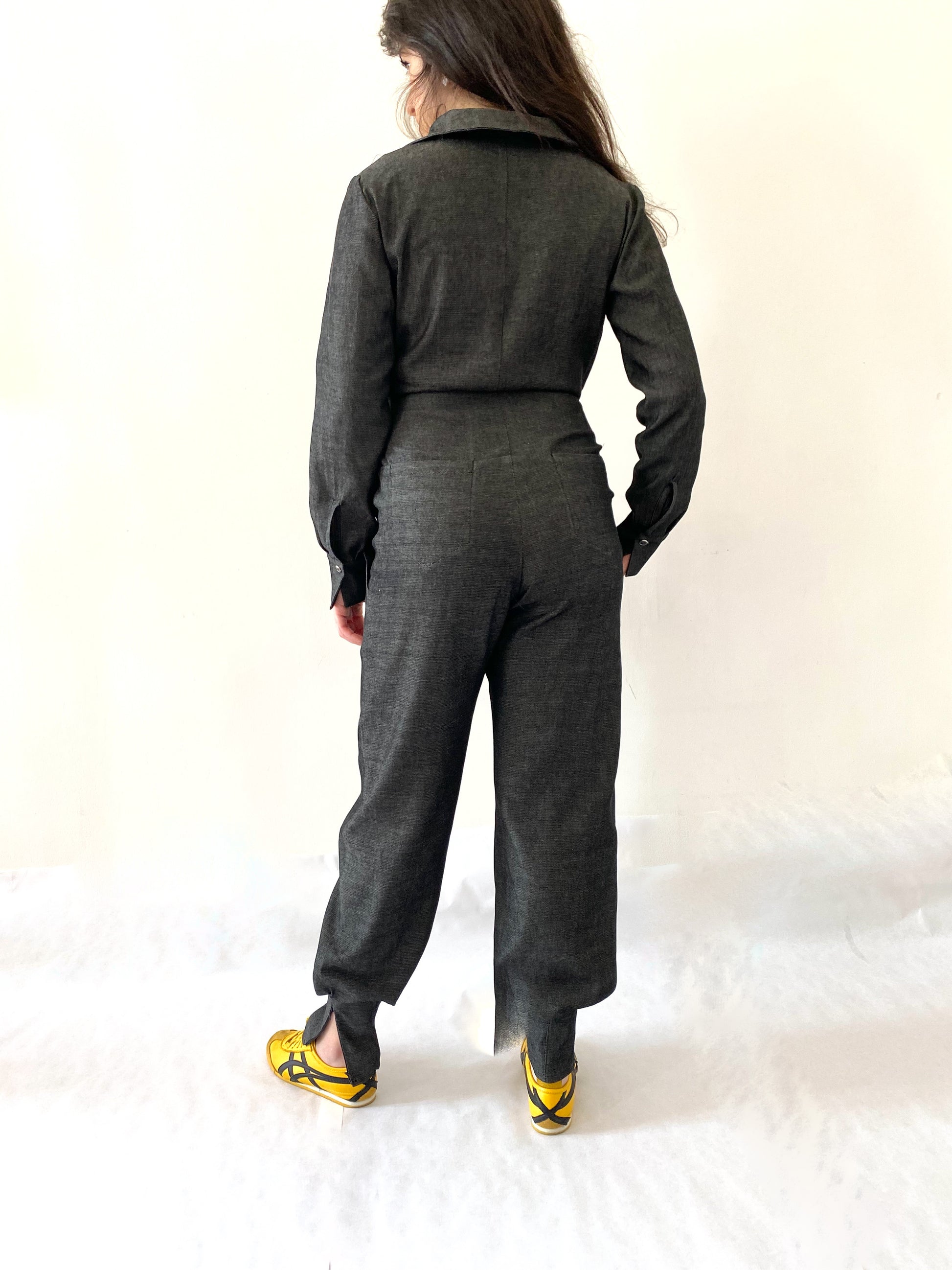 Combinaison zippée devant, ceinturée devant ou au dos par une martingale.